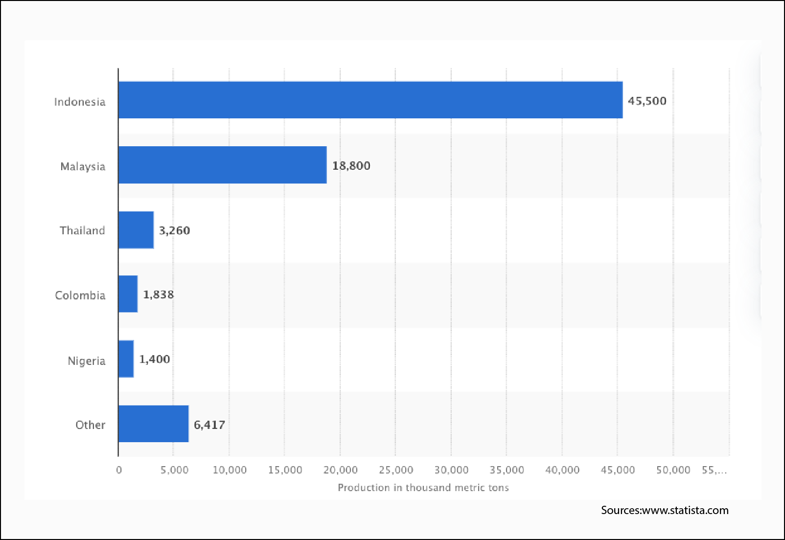Las palmeras aceiteras se cultivan en condiciones tropicales húmedas, que se encuentran entre 8 y 10 grados al norte y al sur del ecuador. Originariamente fundada en África Occidental, la palma aceitera se encuentra ahora en Asia, África y Latinoamérica para satisfacer la demanda mundial. Según Statista, Indonesia es el principal productor mundial de aceite de palma, con una producción de 45.500 toneladas métricas durante el período 2022-2023.